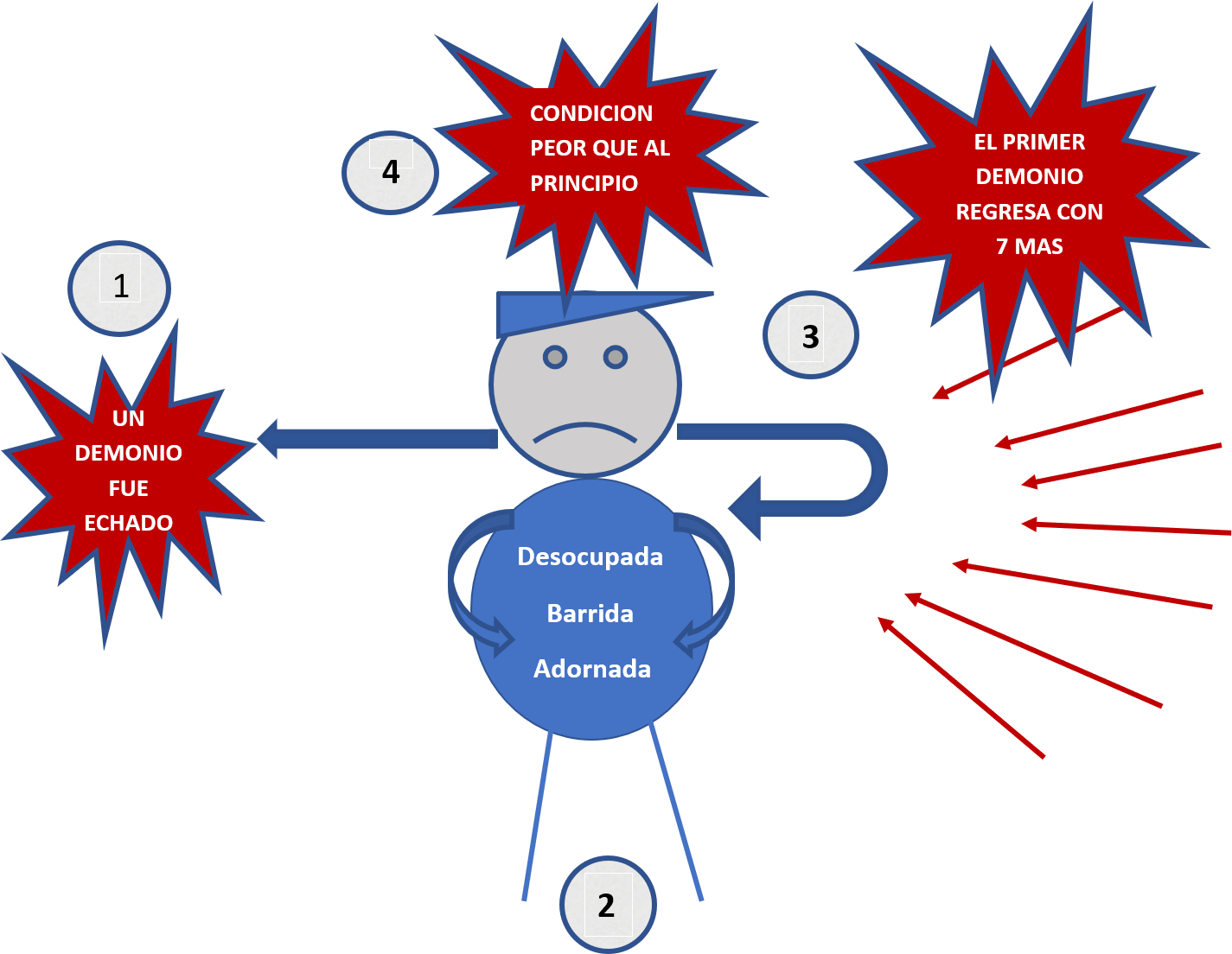 : Esta enseñanza de Jesucristo no es una historia real ni una parábola, sino una verdad sobre el reino de las tinieblas que Jesús quería que sus discípulos entendieran y a la vez la enseñaran a la iglesia. La persona es solo un ejemplo humano que reacciona a un ataque demoniaco. La persona ha sido liberada de un demonio el cual sale a buscar reposo y no lo haya. Entonces decide regresar a la persona otra vez para ver su estado espiritual y la encuentra desocupada, barrida, limpia y adornada. Entonces el demonio va y busca 7 demonios mas malos que el y los 8 entran a la persona y la poseen. Jesús dice que el fin de esta persona es peor que cuando fue liberada.